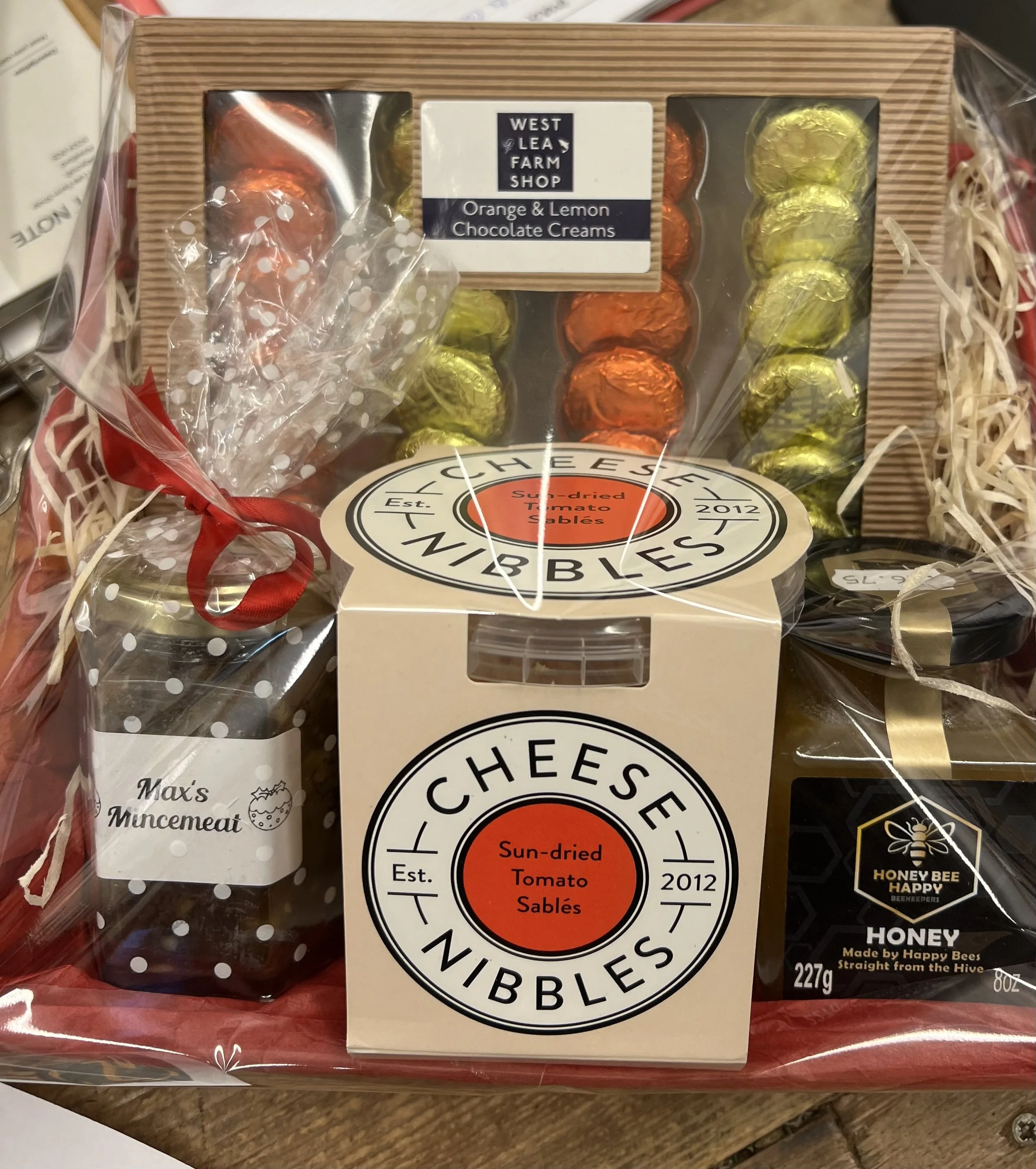 We are happy to make up our recyclable cardboard hampers with any goodies you would like to choose from the shop. Our hampers start at £15/£0 up to any price point you would like. Come and chose yours and we will make it up for you.
